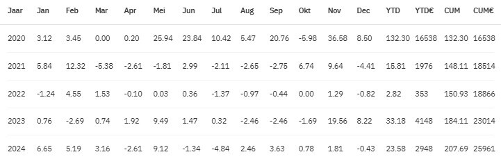 Dit marktneutrale systeem had moeite met de volatiliteit in 2024. Hoewel het jaarresultaat teleurstelde, blijven we vertrouwen houden in de strategie voor toekomstige groei. Het systeem heeft een lange historie en uitstekend risico management.